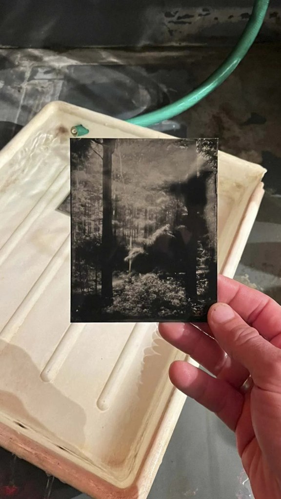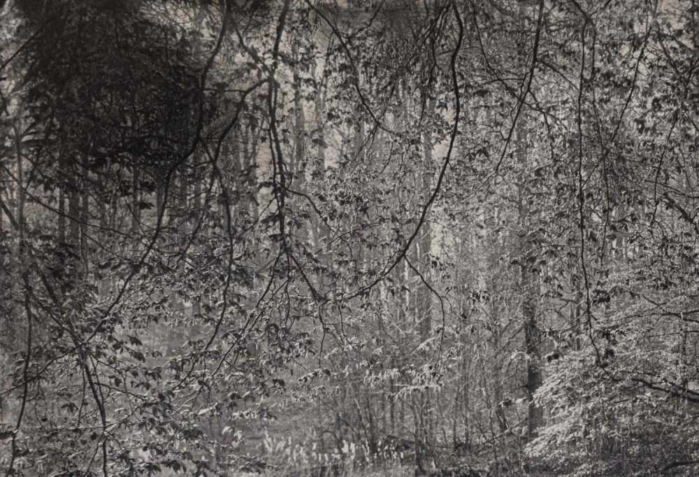 Utilisant un pigment brun appelé Van Dyke Browns ou terre de Cassel, faisant de ses tirages des héritiers de la peinture classique, ce spécialiste des portraits au collodion contemple longuement la forêt comme un paysage bruissant d’entités mystérieuses.