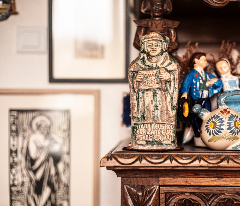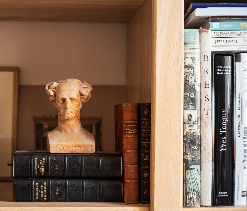 Statuettes de saints locaux, ouvrages de la nrf reliés, piles de livres, globes terrestres, brochure rappelant son amitié avec Julien Gracq, buste miniature de Chateaubriand, volumes concernant la Bretagne, portraits du général de Gaulle, édition de Xavier Grall : nul doute, nous sommes chez Philippe Le Guillou.