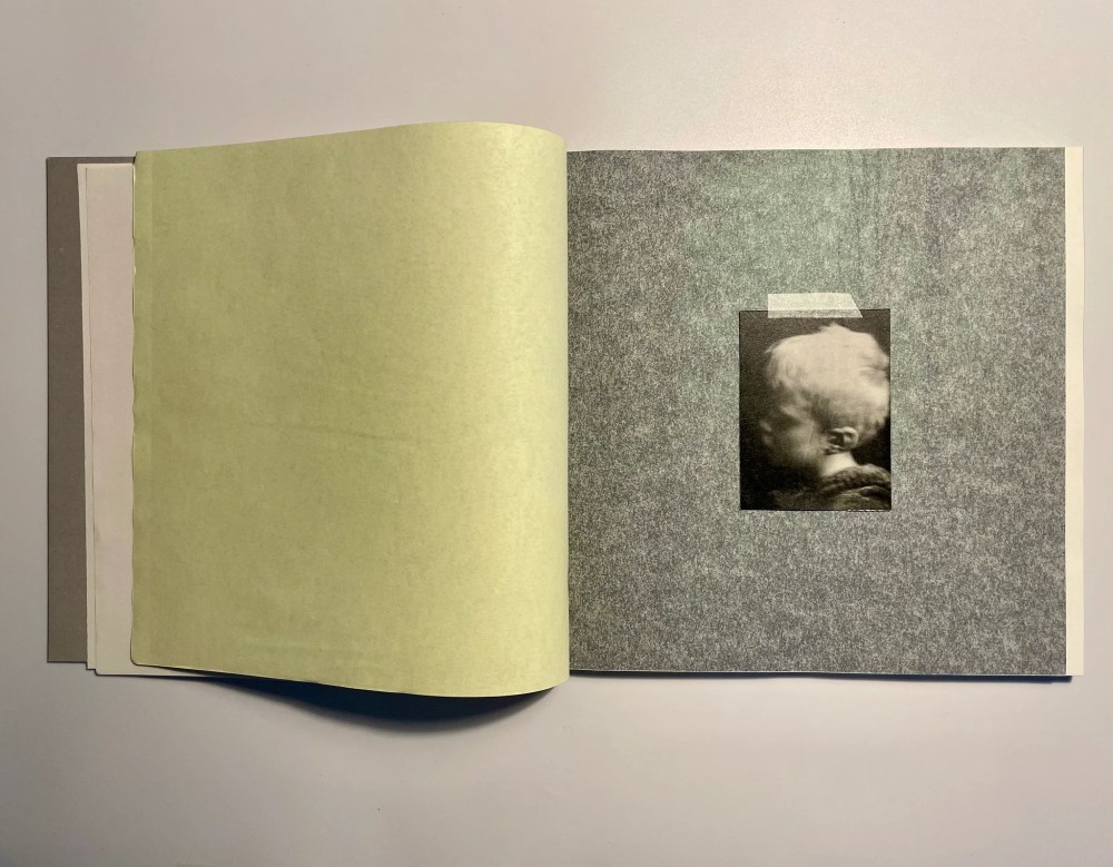 Une image de petite dimension d’un enfant est scotchée délicatement sur une feuille où il paraît perdu, portrait apparaissant sur le rabat d’un quadryptique que l’on déplie avec soin.
