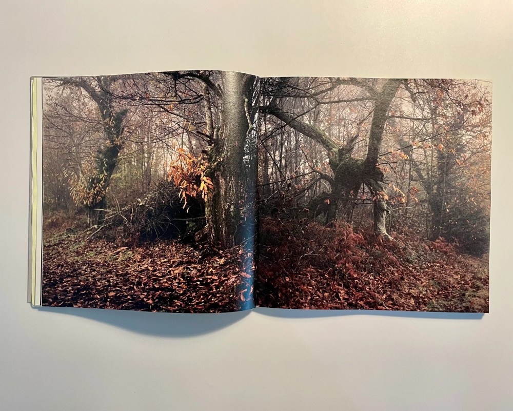 Des écorces presque mauves provoquent une paréidolie, les ramures d’un vénérable chêne ont été pliées par une tempête, le sous-bois prend une couleur de feu.