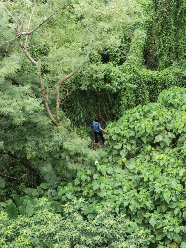 On grimpe à la corde, on se perd dans la luxuriance végétale, on est une silhouette rose sur un mur, prolongée par une coulure de peinture rouge sang répandue sur le sol.