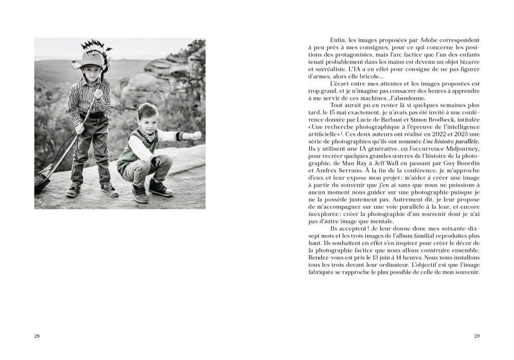 A partir d’une photographie personnelle, perdue, refaçonnée par l’IA, puis doublement retrouvée dans sa matérialité première – l’image d’un petit garçon jouant aux cowboys et aux Indiens avec son grand frère, un duel ayant eu lieu en 1957 -, le psychiatre Serge Tisseron, très attentif à la façon dont les technologies nous transforment, mais aussi aux secrets de famille, s’interroge sur la mémoire comme puissance de retrouvailles et de falsification, processus inhérent à son fonctionnement.
