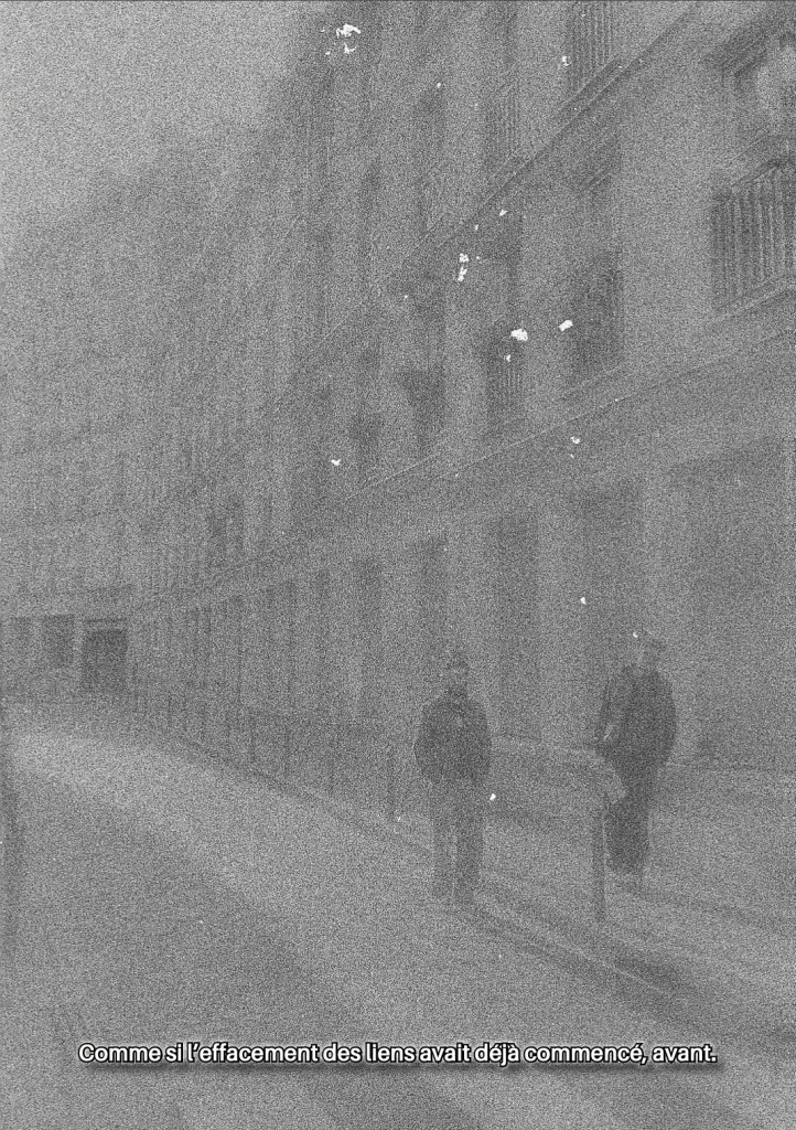 Pas de visages, mais des silhouettes, la clandestinité est de mise dans la transparence obligatoire d’un futur totalitaire.