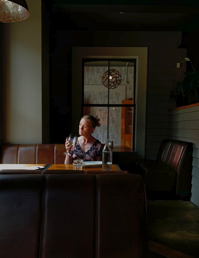 Et cette femme tenant un verre de vin vide, le visage tourné vers le hors-champ, faisant penser à un personnage d’Edward Hopper ou échappé d’une mise en scène de Gregory Crewdson ?