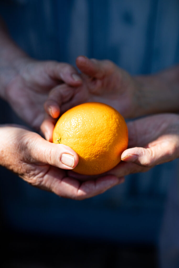 Une orange tenue par des mains chenues nous accueille, signifiant à la fois l’hospitalité, la grâce de la nature et le destin des femmes de ce village frontalier.