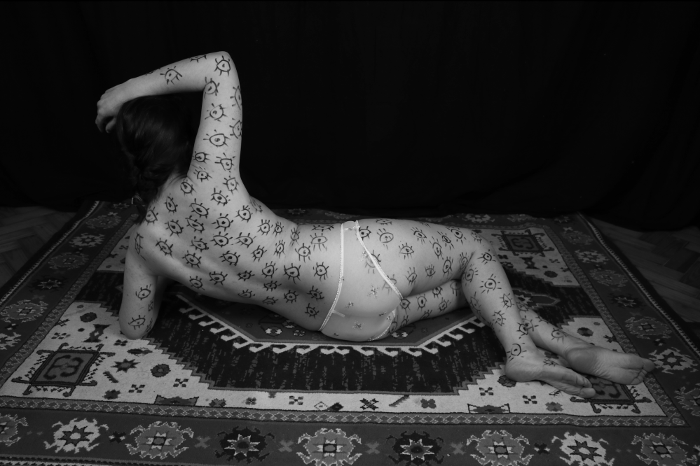 Une mèche allumée pend d’un téton, des couettes dégouttent d’encre noire sur le dos d’un modèle, des yeux sont cachés par la mue d’un serpent, un rouge à lèvres est posé sur les poils pubiens.