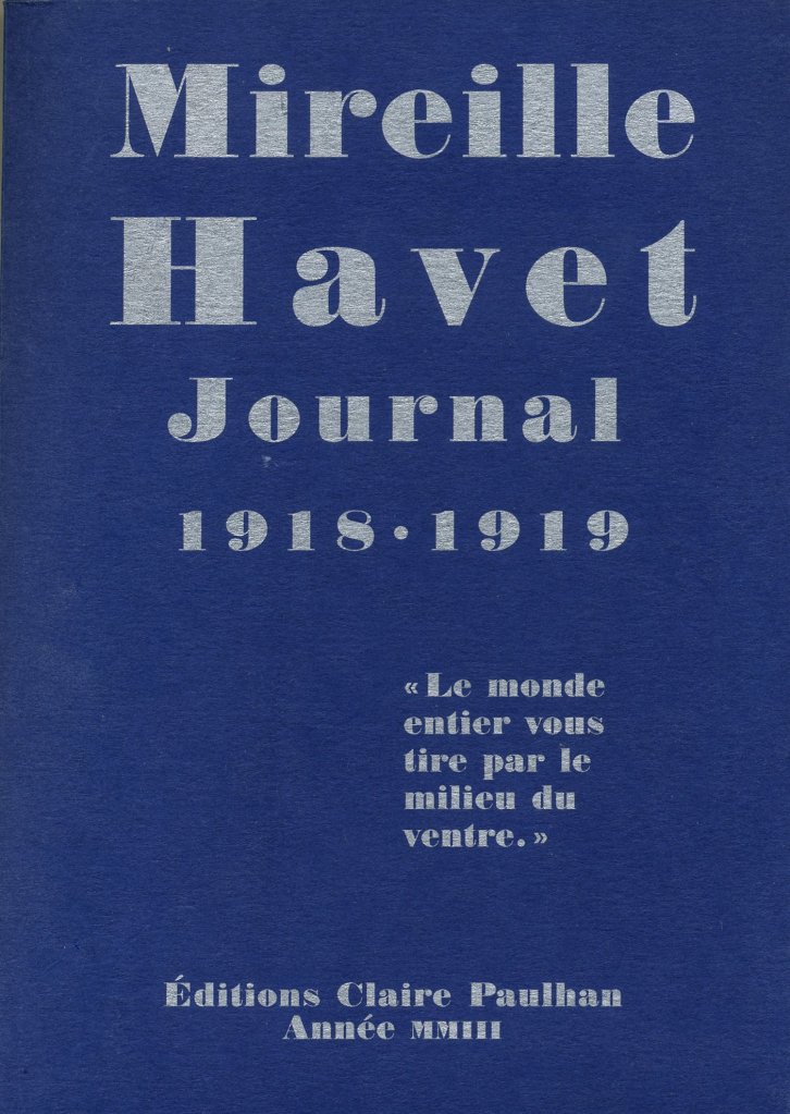 Mireille Havet, Journal 1918-1919, « Le monde entier vous tire par le milieu du ventre. », nouvelle édition revue, augmentée et corrigée / première édition établie par Pierre Plateau, présentée et annotée par Dominique Tiry, avec l’aide de Pierre Plateau, Roland Aeschimann et Claire Paulhan, Editions Claire Paulhan, 2011, 304 pages