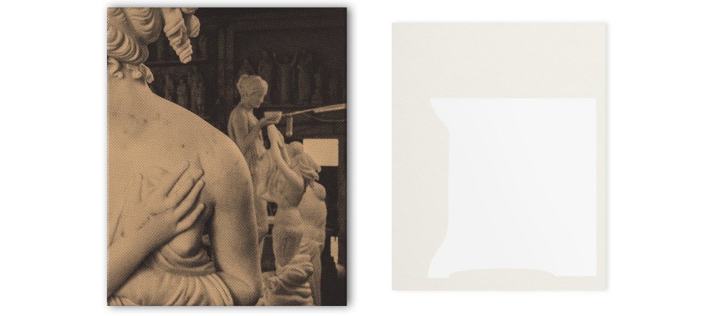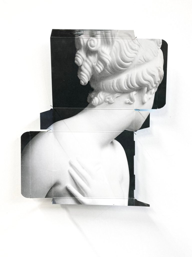 L’artiste a choisi de présenter sur papier ivoire épais (Fedrigoni en trois grammages différents) des images rappelant le procédé du carton déplié – des patrons d’emballages -, c’est-à-dire que leurs bords forment des franges dont on peut supposer qu’elles s’ajusteraient si nous les manipulions.