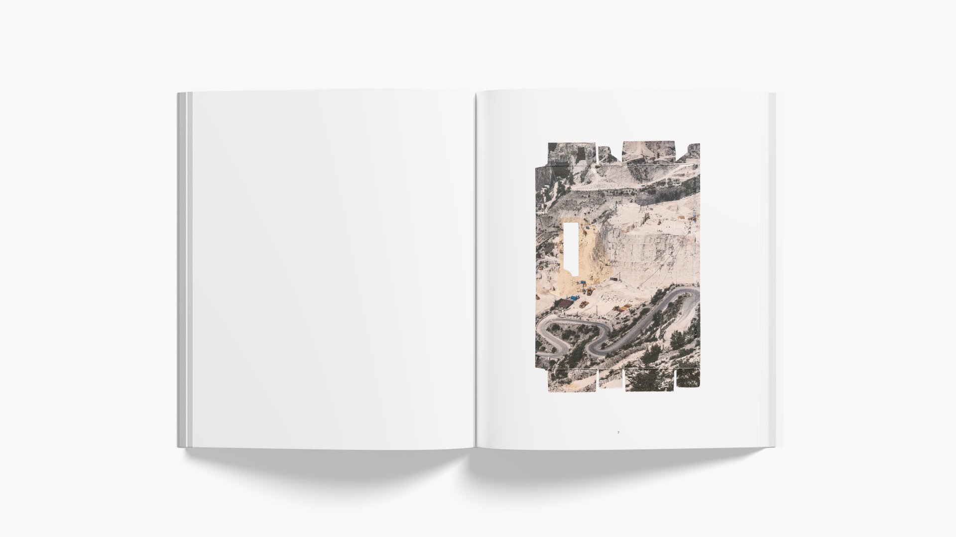 Un appendice (Appendix) nous renseigne : « Hélène Bellenger a constitué une collection de produits de consommation contenant du carbonate de calcium, sur lesquels elle imprime directement, au verso du carton d’emballage. L’imaginaire luxueux et impérieux associé à la statuaire en marbre se trouve ici reproduit sous forme d’images sur de petits emballages. A la fois précieuses et uniques, mais aussi éphémères et fragiles, ces petites images, dont la forme varie selon les produits, proposent une typologie des formes industrielles tout en présentant une sélection d’images de ces paysages modelés par l’exploitation du marbre de Carrare depuis plus de 2000 ans. »