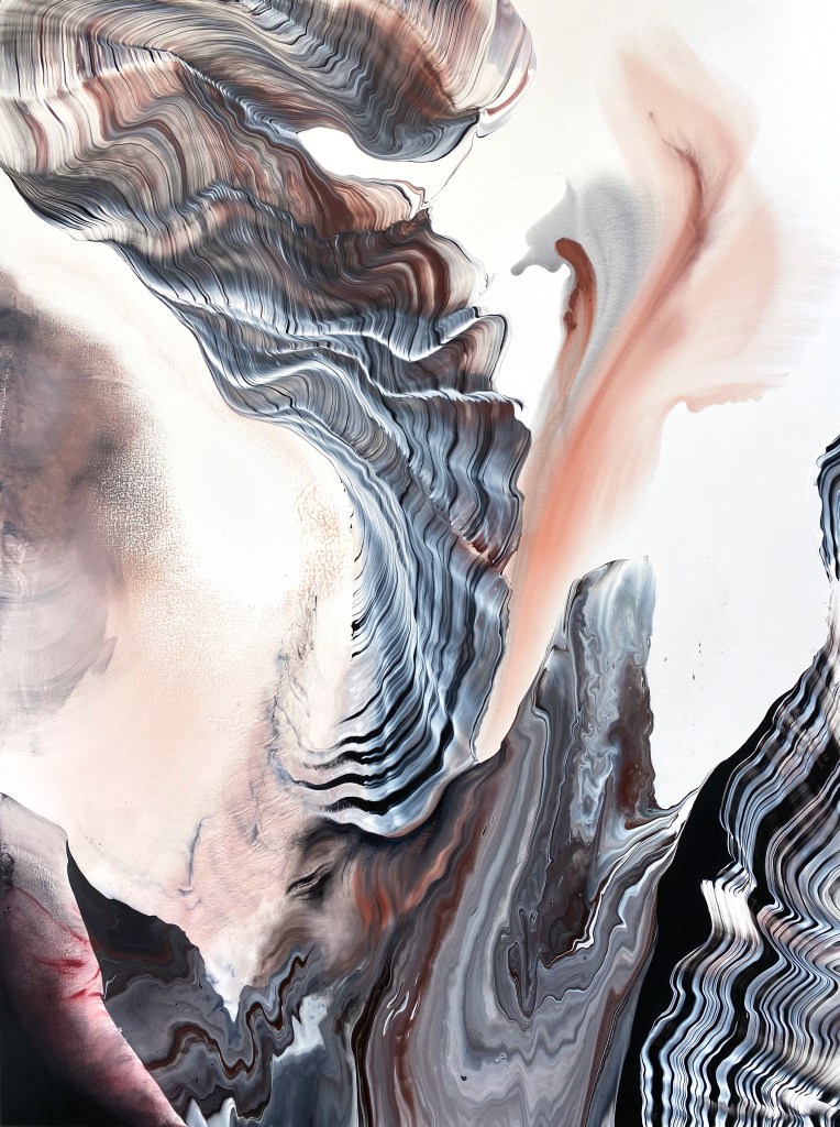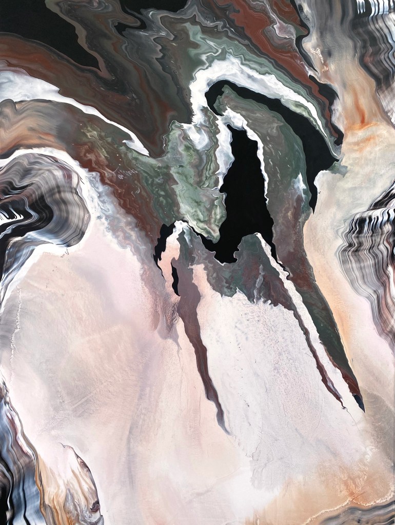 Colin Lemoine emploie les termes de la géographie (adrec, ubac, jusant, coupe longitudinale…) pour exprimer le continent des gestes dansés du peintre, engageant des profusions de paréidolies.