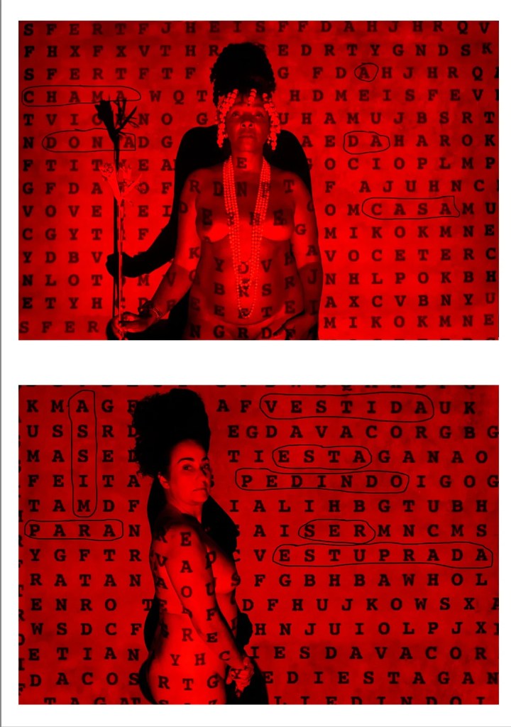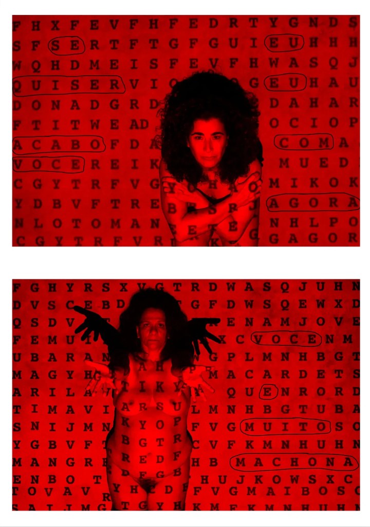 Photographiées sur fond rouge, couleur évoquant la lumière d’un laboratoire argentique, les femmes qu’a rencontrées Marcia Charnizon sont presque toutes nues, le corps quadrillé de mots offensants projetés sur elles – en portugais.