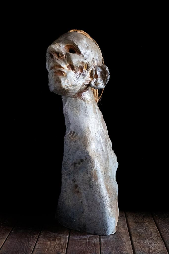 En sculpture, par ses personnages au nez levé, Ophélia Derrely cherche l’air puisque tout est asphyxié, vicié, pollué.