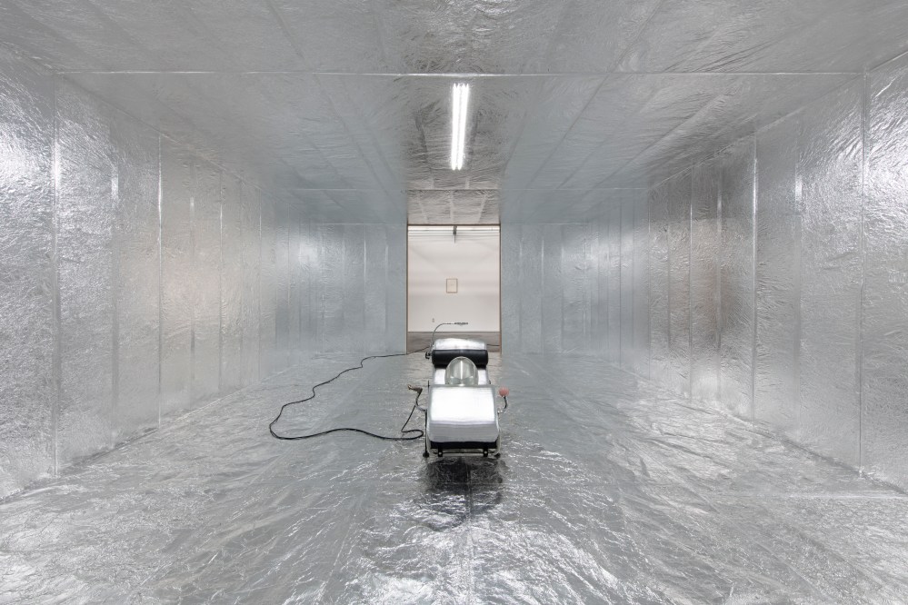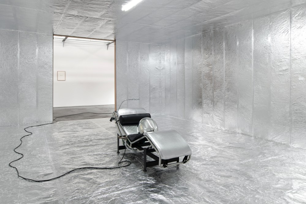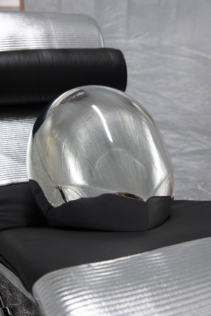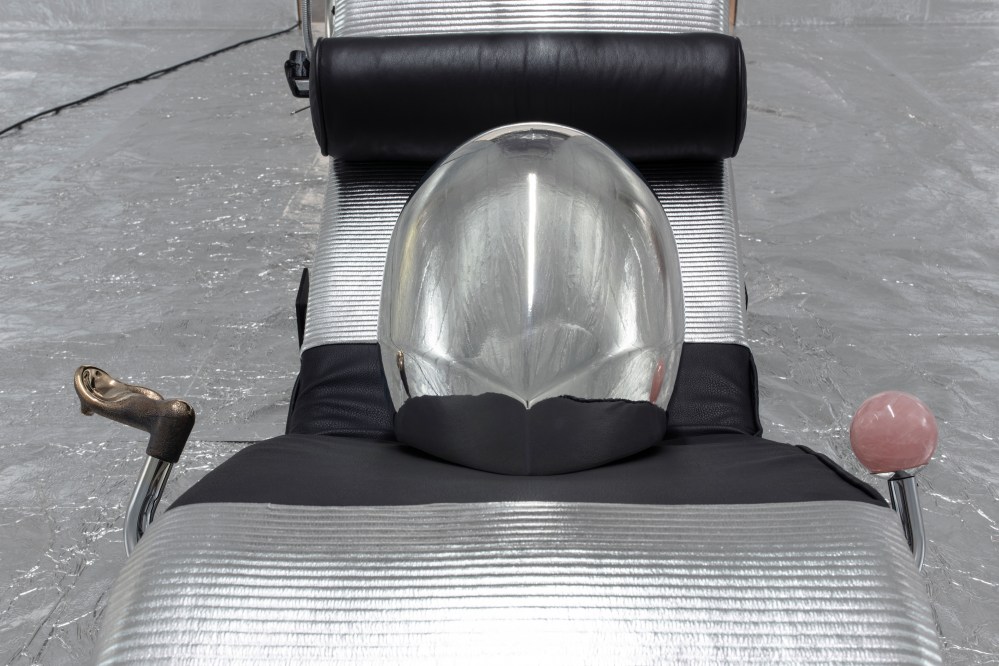 A l’objet emblématique du design moderniste, l’artiste belge a ajouté, le faisant ainsi dériver, un casque intégral, une housse synthétique, des éléments high tech et vernaculaires, transformant la pièce historique en vaisseau spatial psychique permettant de voyager dans le passé et le futur alors que s’ouvre l’éternité dans le présent.