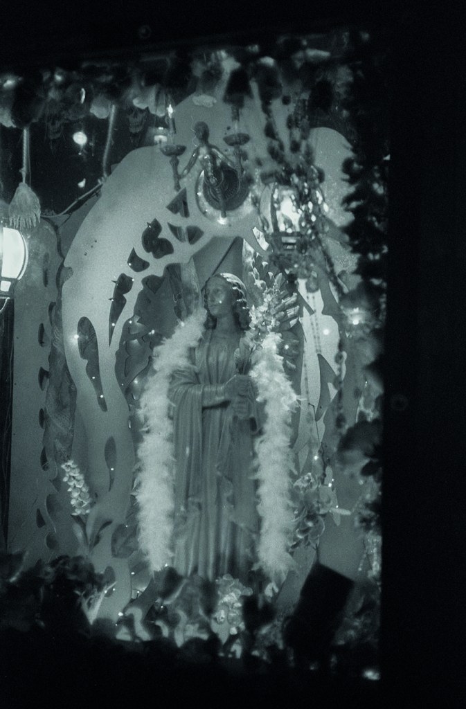 Une sainte tient dans quelque lieu religieux un bouquet de fleurs, à deux pas d’un restaurant communautaire africain.