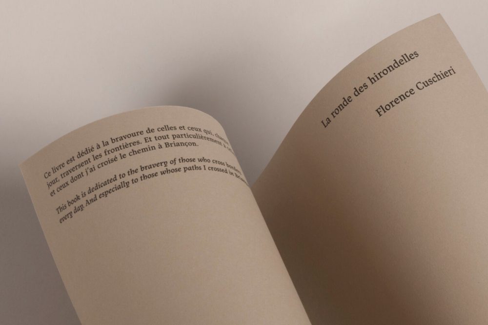 Se présentant sous reliure souple avec dos nu, La ronde des hirondelles est essentiellement un livre de paysages, montrant le territoires des Alpes, du côté de Briançon, que traversent en clandestin hommes et femmes en exil.