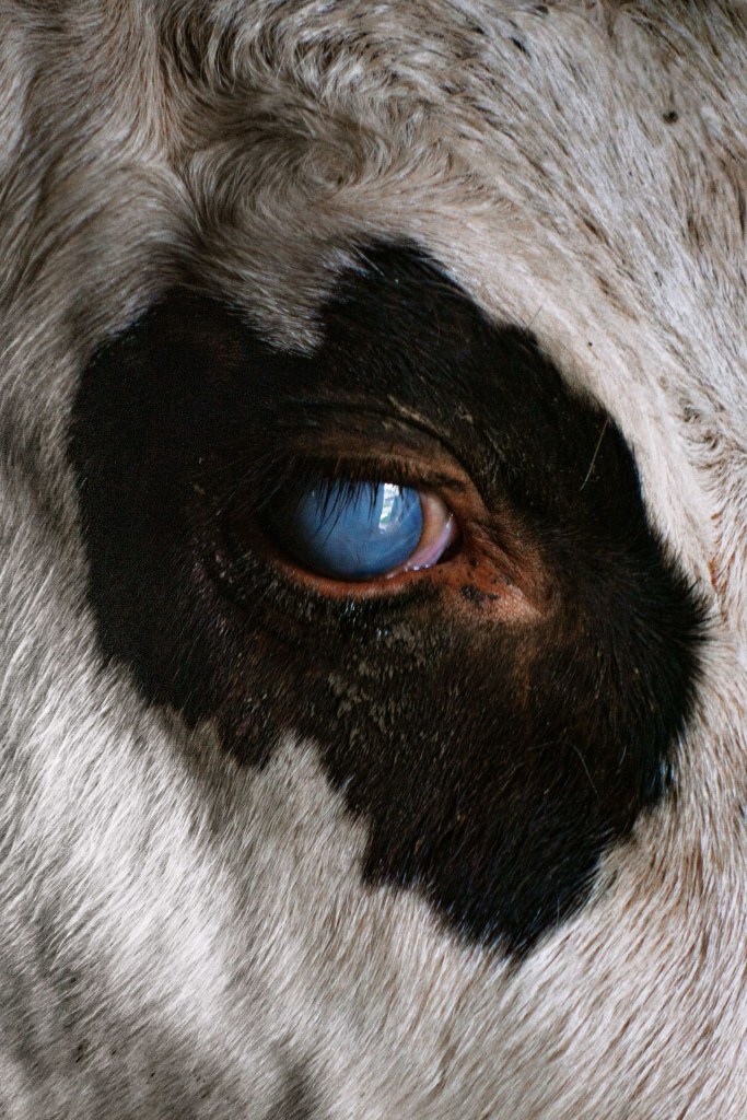 Gestes de soin envers les bêtes, héraldique des peaux et des mains vieillies, œil bleu vitreux de l’animal mélancolique.