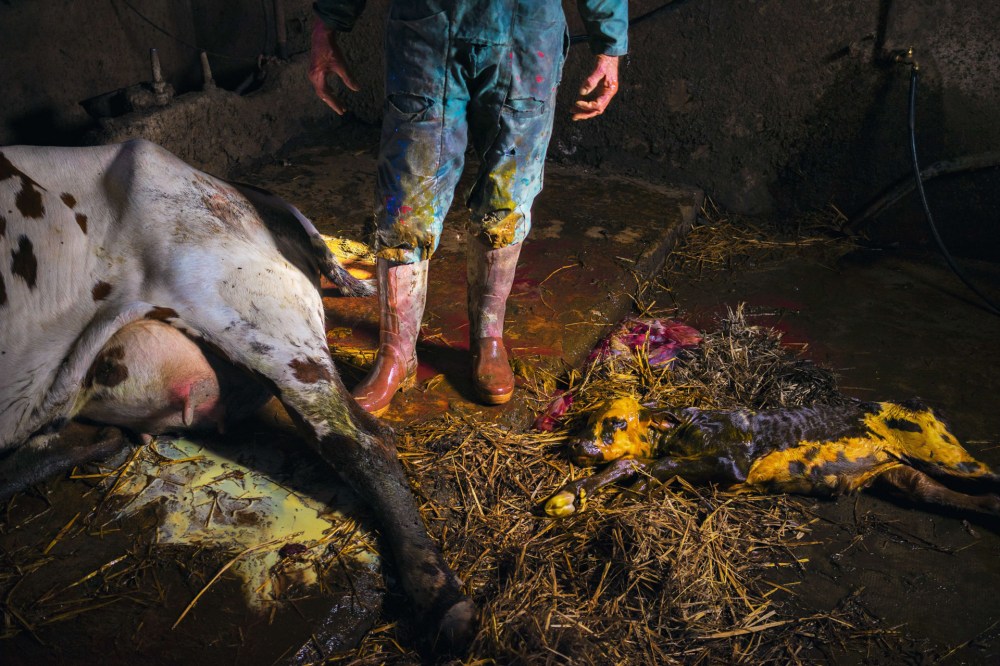 S’intéressant aux textures et matières, Lionel Jusseret contemple, dans une photographie sidérante de vie, de sang et de fantastique, un vêlage comme l’action d’un véritable dripping pollockien.