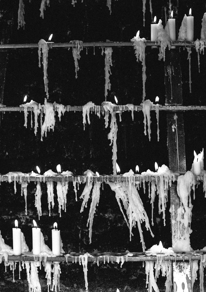 Dieu est là : bougies se consumant, oiseaux perchés fondus, roue du samsara, croix christique, oiseau déchu, corps enlacés.