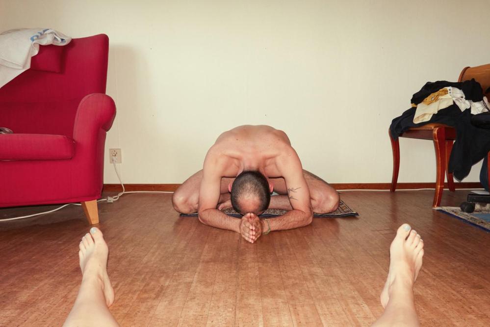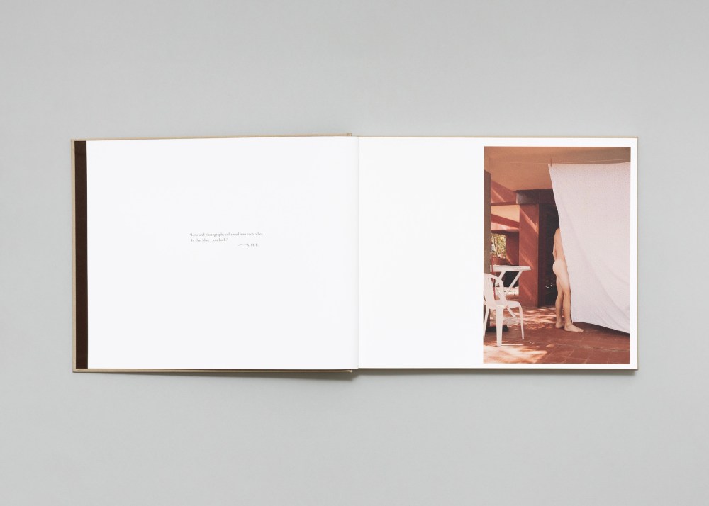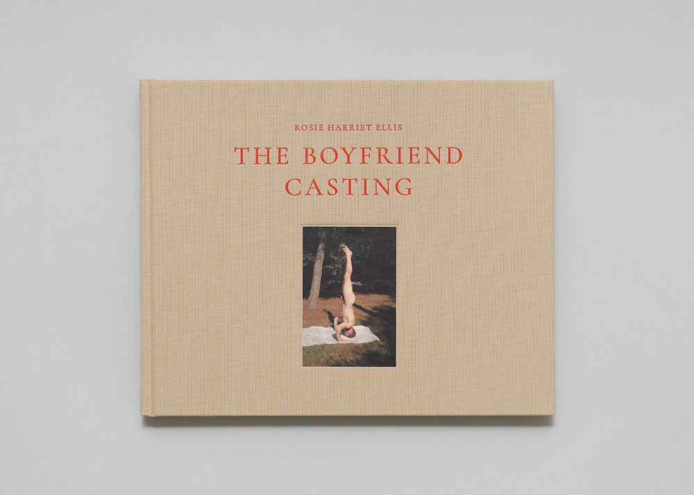 Livre de format italien à la belle couverture entoilée sur laquelle est collée la photographie d’un homme nu faisant le poirier, The boyfriend casting, de Rosie Harriet Ellis, est une œuvre de dimension intime.