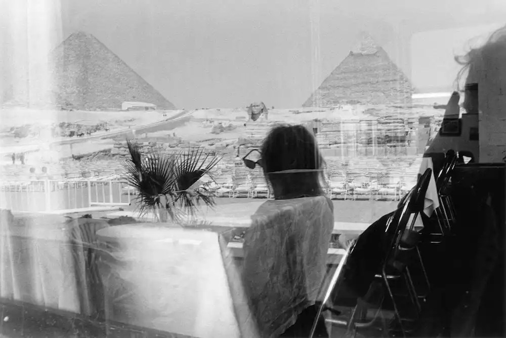 Apparaît dans son corpus à plusieurs reprises la pyramide de Gizeh, c’est le tombeau d’un roi moderne, déchu, errant, conscient des nécessités du semblant – sinon la psychose -, l’appareil photographique étant un scribe, et le trépied un sceptre pharaonique.