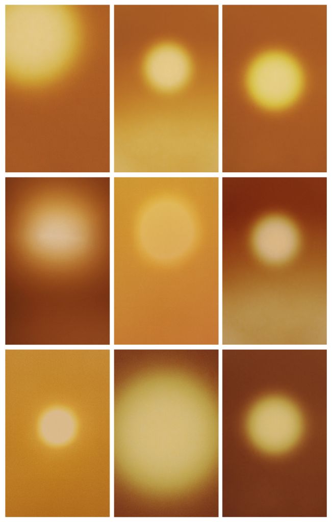 Des éléments sont disposés dans l’espace, il y a dialogue entre l’énergétique des couleurs et le vide, alors que, sur papier plus fin, le soleil, disposé en mosaïque d’images, joue son implacable partition.