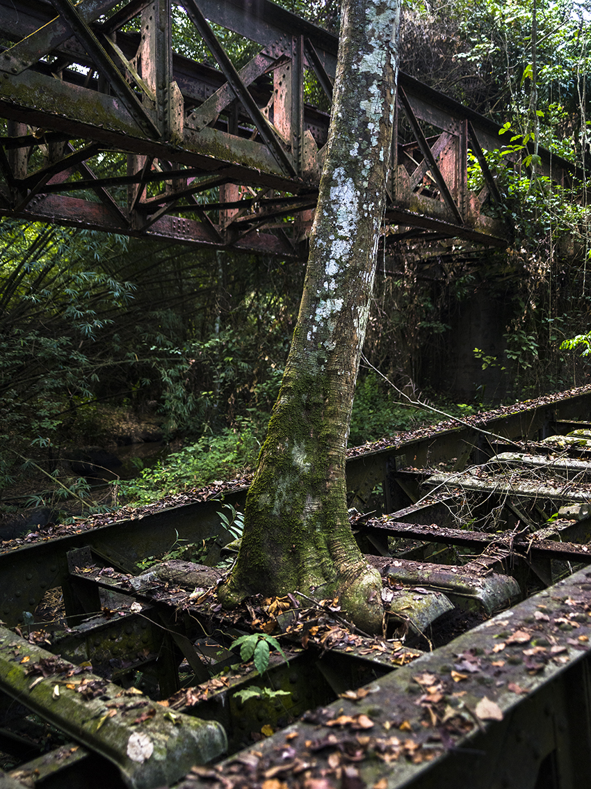 Un effort d’acier trouant une végétation parfois luxuriante ; des infrastructures vétustes rongées par le temps ; une fresque composée à partir d’images collectées.