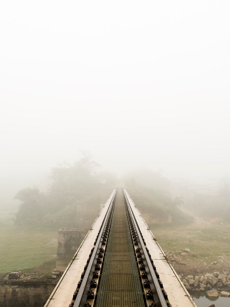 Des brumes, des rails plongeant dans le gris, des formes naturelles ou anthropiques, bâtiment abandonné, roches bosselées comme un dos d’éléphant, puissance d’un arbre poussant entre les traverses.