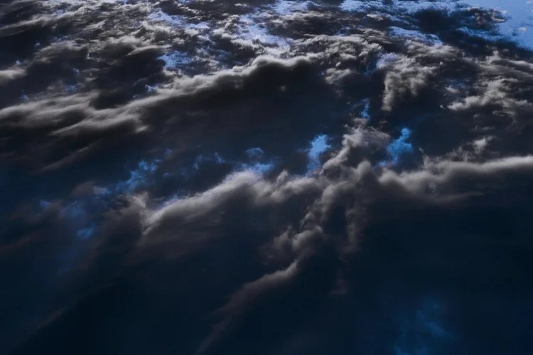Mer de nuages, fumeroles bleues et grises.