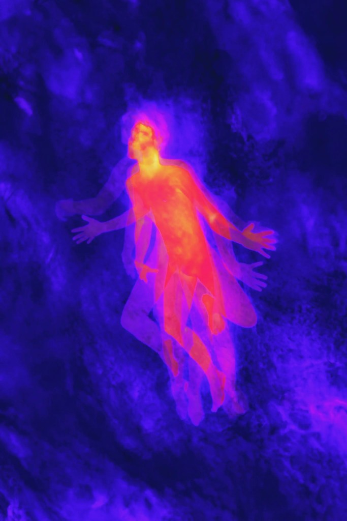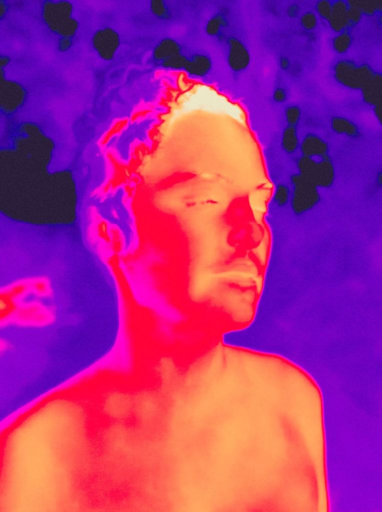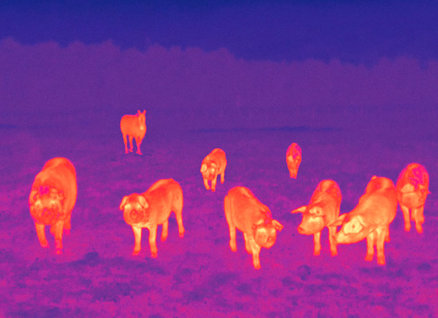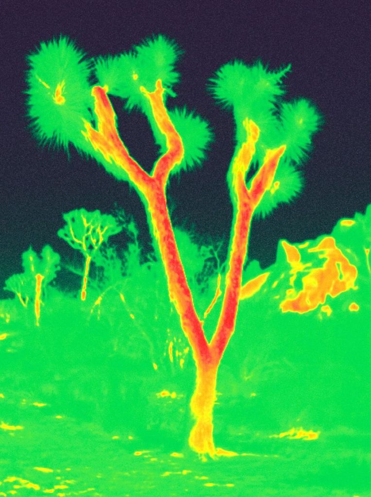 L’utilisation de la caméra thermique, bien évidemment détournée de son usage premier militaire, permet de percevoir cette chaleur énergétique, les images produites relevant du sublime fantomatique unissant aussi bien les animaux (les cochons, un coyote, un cheval) et les humains, que les végétaux, les roches et les ciels.