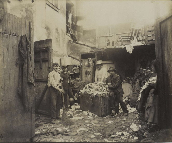 Grand lecteur de publications engagées, Atget a documenté la disparition du vieux Paris – on pointe généralement sa capacité à montre une ville vidée de sa substance -, mais aussi celle des petits métiers menacés, les biffins de la marge, vivant dans des conditions très précaires, apparaissant de plus en plus comme anachroniques.
