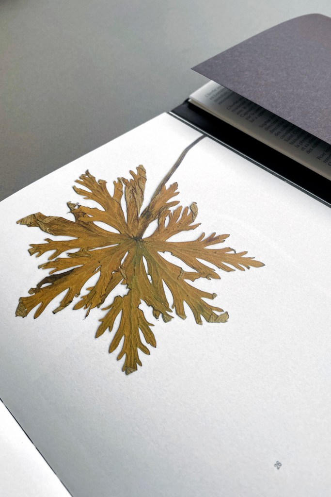 Le cahier de droite relève davantage de la scientificité : les plantes sont légendées, et précisément situées dans le temps ; l’historienne de la photographie, commissaire d’exposition et attachée de conservation au Centre Pompidou livre une préface ; Sophie Zénon, le tireur-filtreur Diamantino Quintas et le botaniste François Vernier, interrogés par Estelle Lacanal et Ingrid Coumes-Marquet, se prêtent à l’exercice des propos croisés.