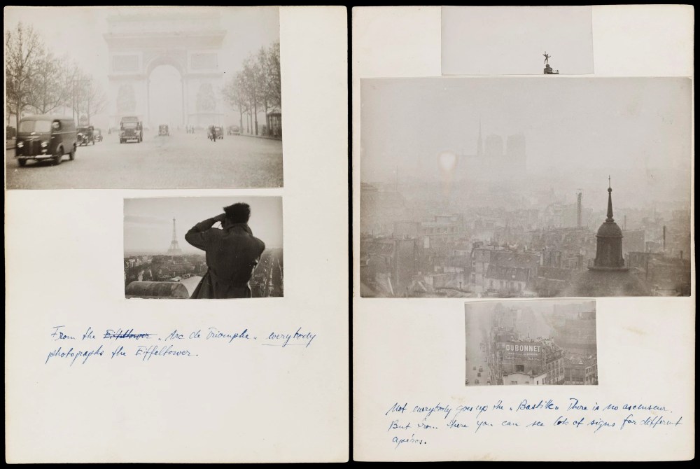Mary’s Book offre Paris à une aimée (Arc de Triomphe, Tour Eiffel, Notre-Dame, inscriptions publicitaires, lanterne à gaz, bouche de métro, place de la Bastille), mais dans une perspective qui est celle d’un auteur collectant des images tel un archiviste du présent, ou, pour reprendre la pensée de Walter Benjamin, un chiffonnier.