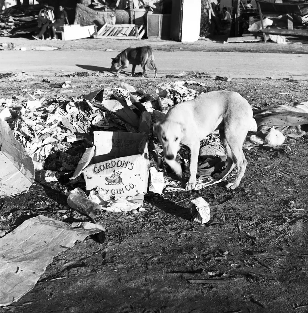 Des chiens traînent parmi des ruines, on voit des abris de fortune, des barbelés, des soldats armés, une désolation dans le miroir du Rolleiflex.