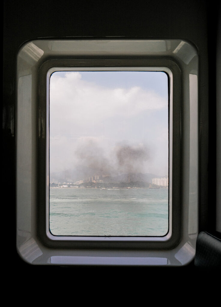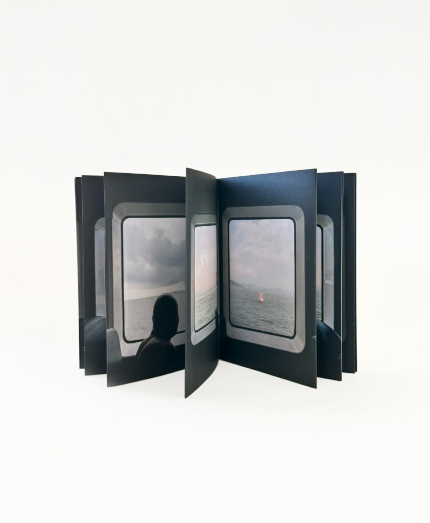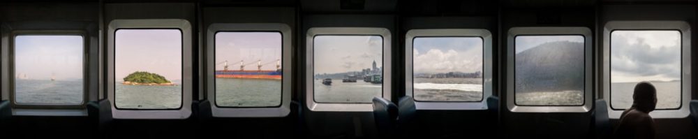 En son verso, depuis le hublot d’un ferry, défilent des scènes témoignant d’un trajet, depuis le départ d’un port imposant, moderne, asiatique peut-être.