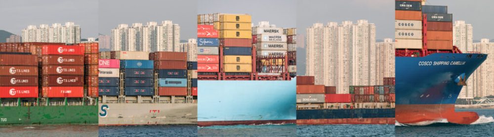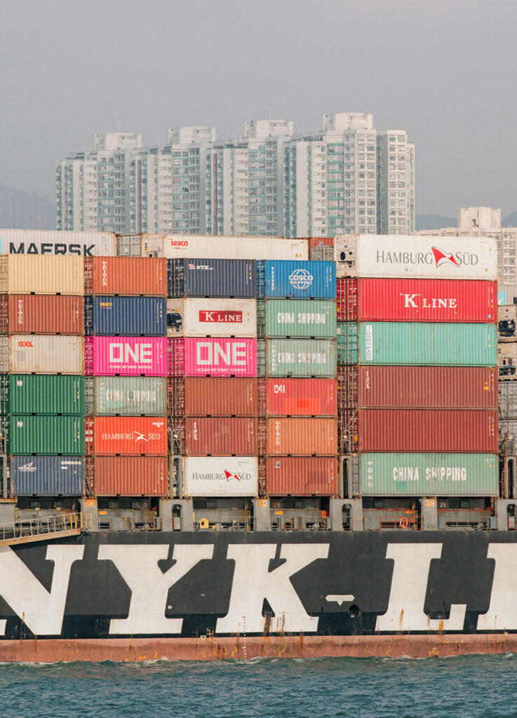Il forme, déplié en son recto, un gigantesque cargo, montagne de fer remplie de containers évoquant l’intense trafic maritime mondial.