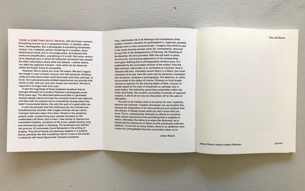Johan Renck meets Anders Petersen,The Left Shore, texte (anglais, suédois) Johan Renck, editing and sequencing Gösta Flemming, Anders Petersen, final art Johan Lindberg, The Left Shore, Journal Photobooks (Suède), 2025, 120 pages