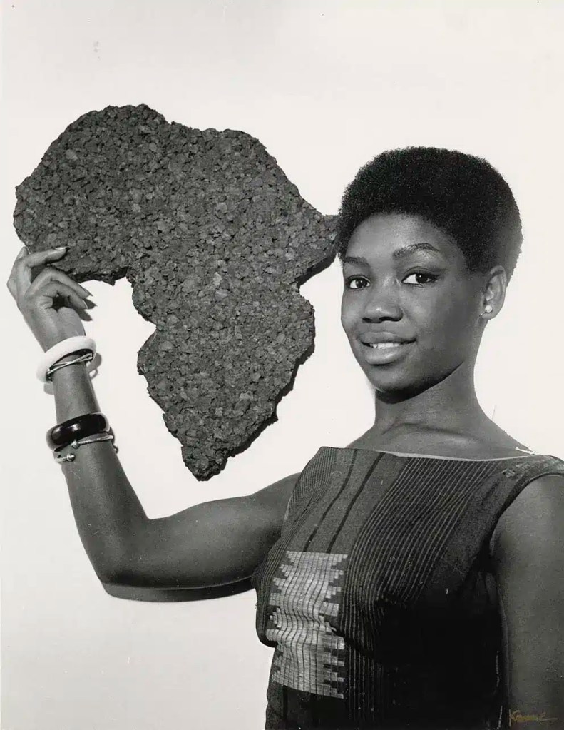 © Kwame Brathwaite. Le mannequin Grandassa, Helene Brathwaite, alias Nomsa Brath, désigne le Congo sur une plaque murale représentant le continent africain. Vers 1964, tirage gélatino argentique vintage, 36,8 × 27,9 cm.. Courtesy of the Kwame Brathwaite Archive and Philip Martin Gallery, Los Angeles