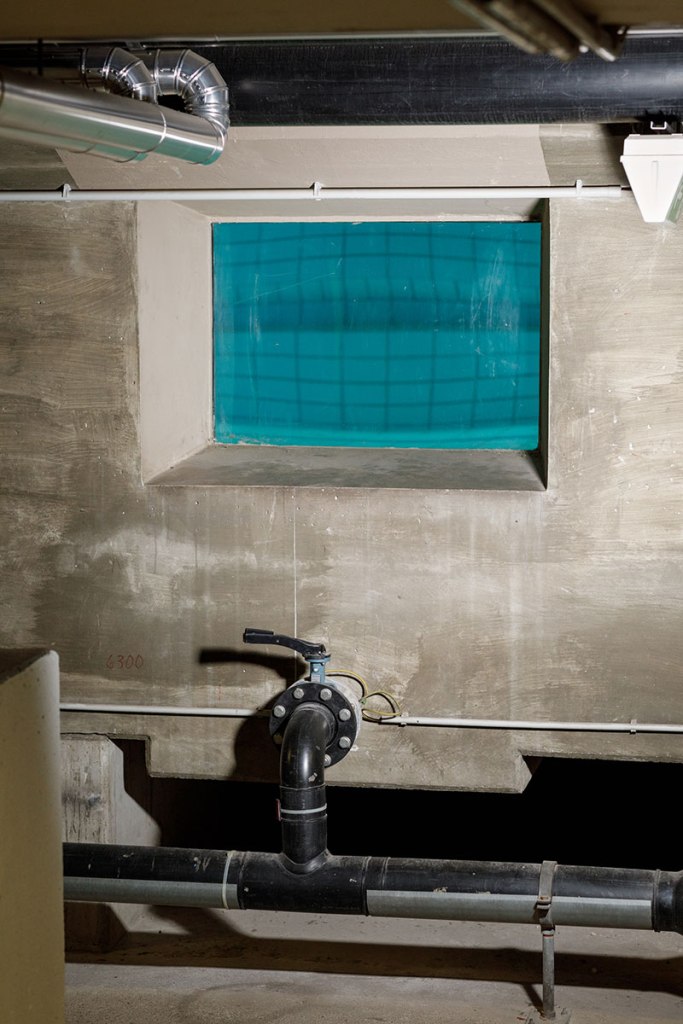 Génie de la machinerie, Michael Rathmayr explorant les entrailles de la piscine, comme on découvre le ventre d’un gros animal.