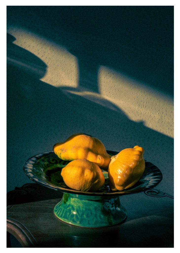 Une jeune femme se baigne, de petites courges jaunes reposent sur un plat en faïence bleu-vert, un végétal s’émancipe d’une palissade en bois.