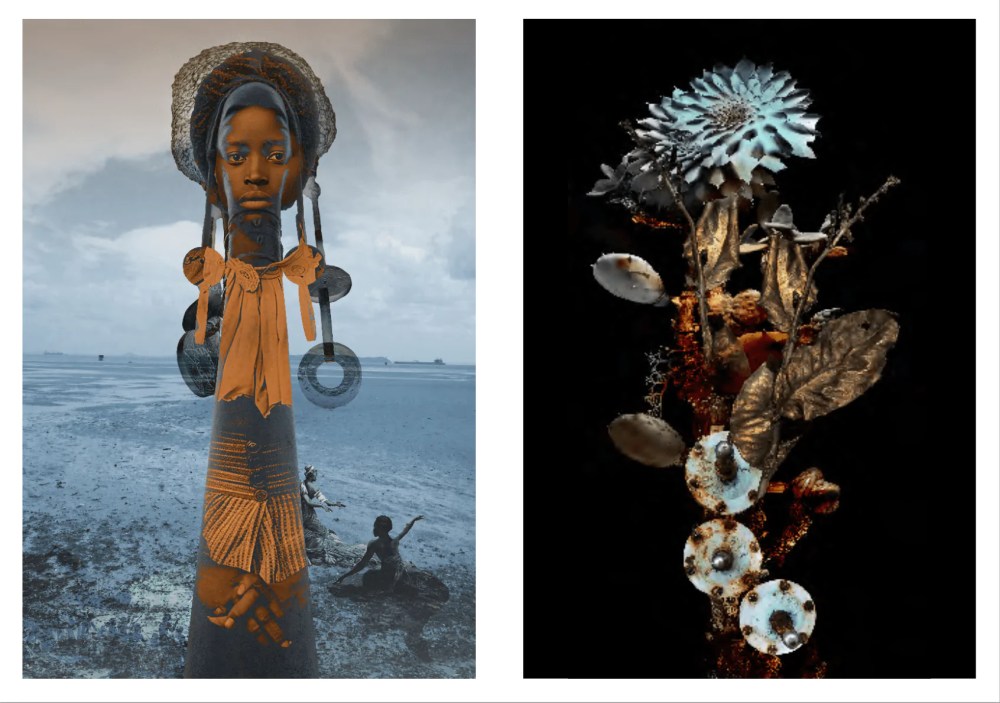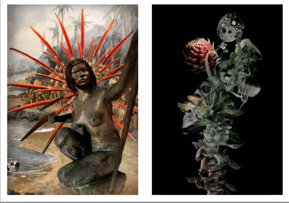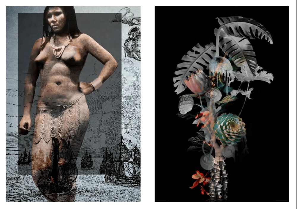Poussent des fleurs fantastiques, bouquets de natures mortes étranges regardées par des déesses aux seins nus.