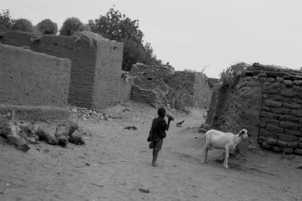 Une chèvre bicolore, trois jattes posées sur le sable comme des divinités, un pneu qu’un enfant pousse.